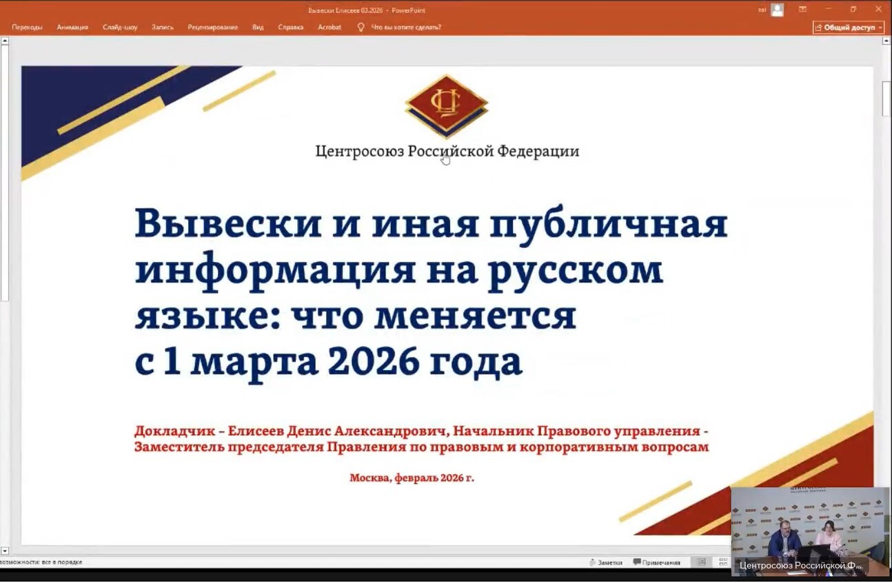 Важным на совещании было выступление Дениса Елисеева, зам. председателя Правления Центросоюза по правовым и корпоративным вопросам. Он подробно рассказал о вступающем в силу с 1 марта 2026 года Федеральном законе (№ 168-ФЗ от 24 июня 2025 г.) по новым требованиям к оформлению вывесок и иной доступной информации. Он отметил, на что следует обратить внимание и какие формулировки и визуальные решения потребуют корректировки. Цель нового закона – дать возможность клиенту ознакомиться с информацией без словаря, переводчика, знания иностранных языков.