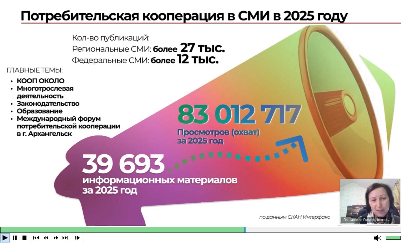 Совещание по информационной работе с представителями регионов, ответственными за работу со СМИ, состоялось в режиме онлайн на этой неделе. Подведены итоги 2025 года и января, определены задачи и основные темы на предстоящий период. Самыми значимыми событиями будут – 195 лет потребительской кооперации России и Международный форум потребительской кооперации в Казани с акцентом на молодежную проблематику.