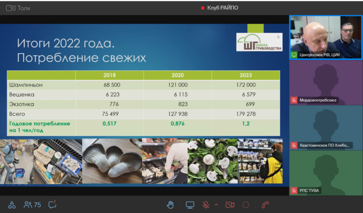 Состоялось очередное заседание клуба «РАЙПО». Участники проекта познакомились с успешными практиками круглогодичного выращивания грибов предприятиями системы потребительской кооперации и тенденциями развития грибоводства в России и в мире. В работе Клуба приняли участие 80 представителей региональных и районных организаций системы потребительской кооперации. От Псковского облпотребсоюза участие в работе клуба принял начальник по заготовкам Валерий Самсонов.
