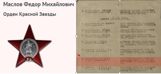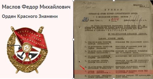 В приказе от 22 июня 1944 года по 145-й стрелковой Витебской дивизии говорится: «За образцовое выполнение боевых заданий, проявленный личный героизм и отвагу наградить майора Маслова Ф.М., первого помощника начальника штаба 729 стрелкового полка 145 стрелковой дивизии Орденом Красного Знамени.»