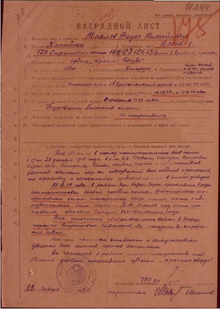 За четкость в работе и личную инициативу капитан Маслов Ф.М. достоин награждения Орденом Красной Звезды, Наград лист от 22 января 1944 г.