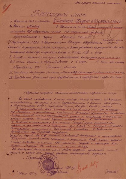 Документы из архивов о награждении Федора Маслова свидетельствуют о его мужестве и отваге.